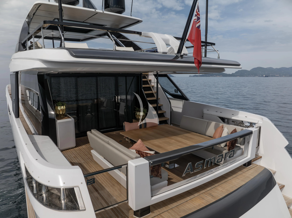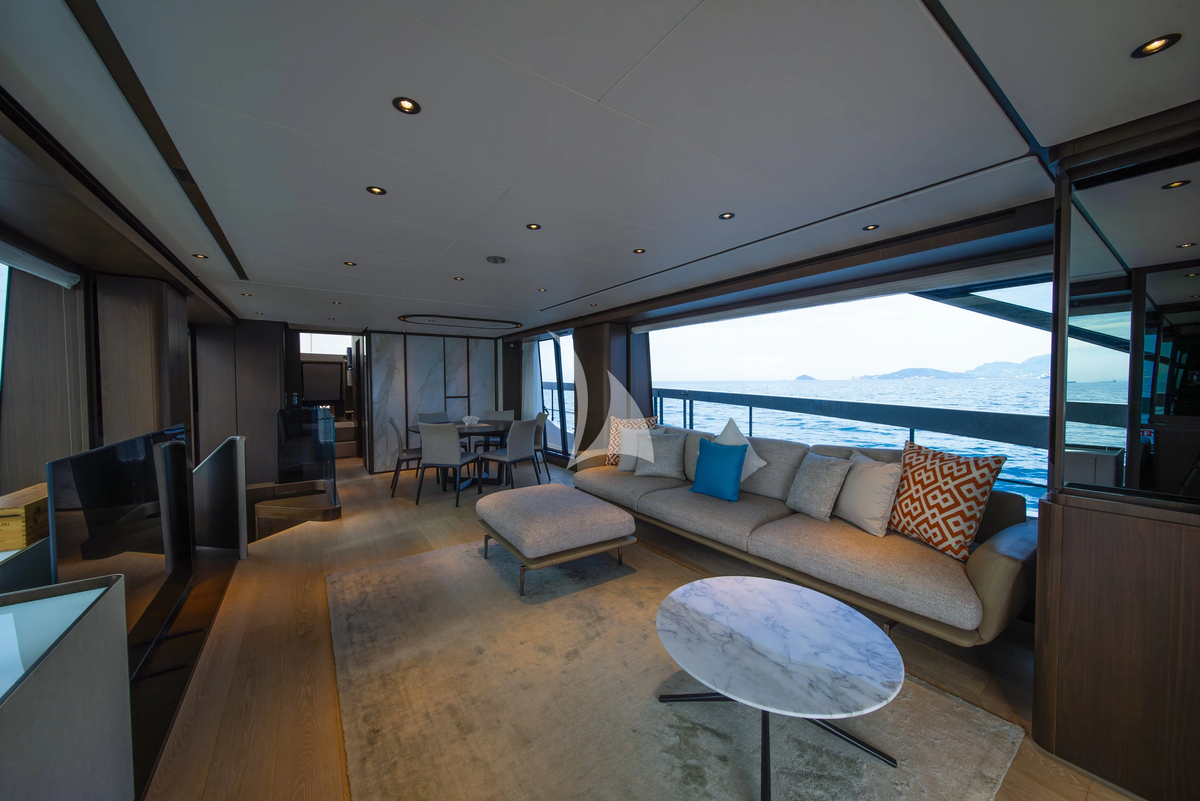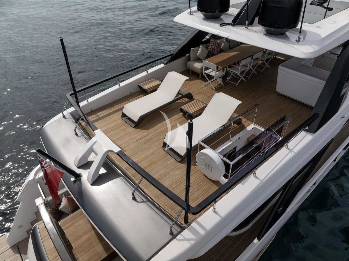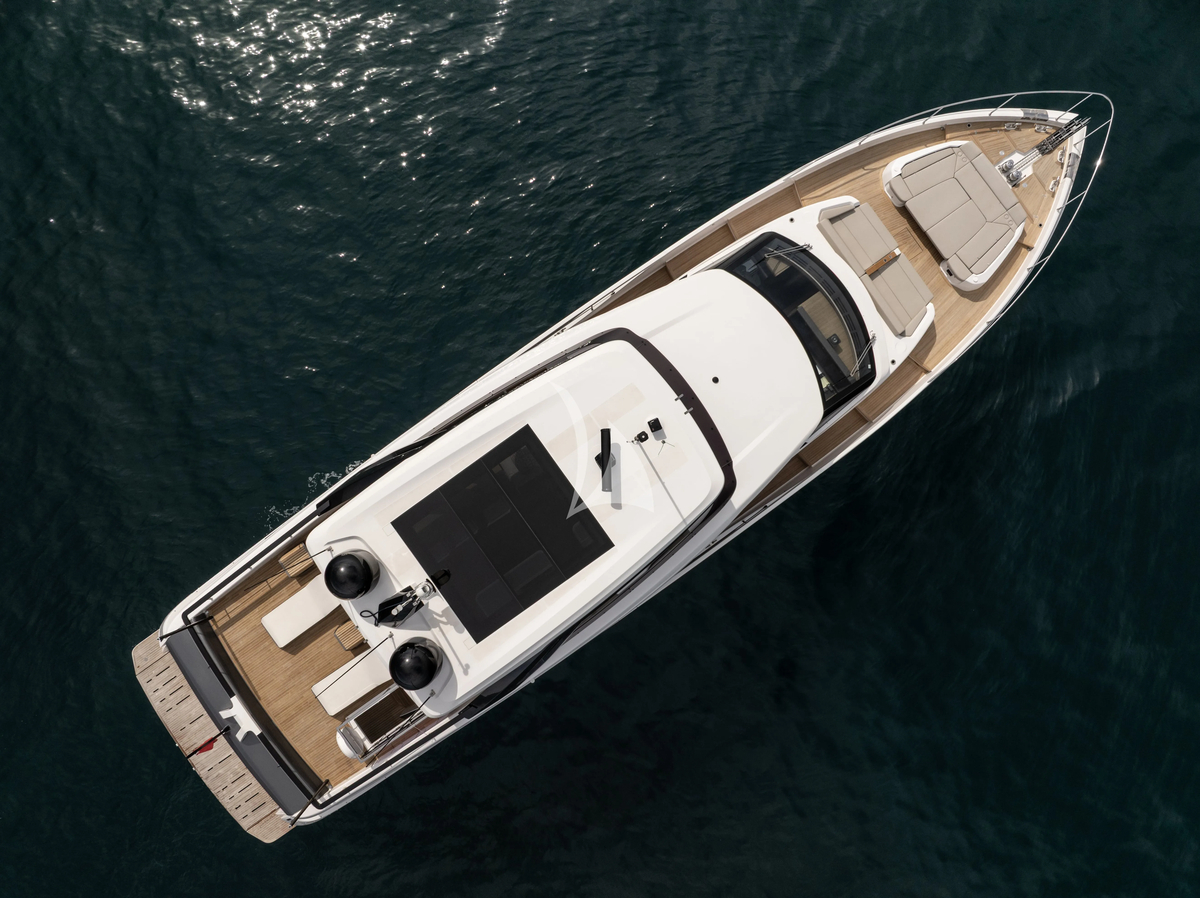Generous exterior spaces, from the cockpit to the flybridge and foredeck, provide multiple settings for dining, sunbathing and entertaining, making the Ferretti 860 an ideal platform for a refined and effortless charter experience.