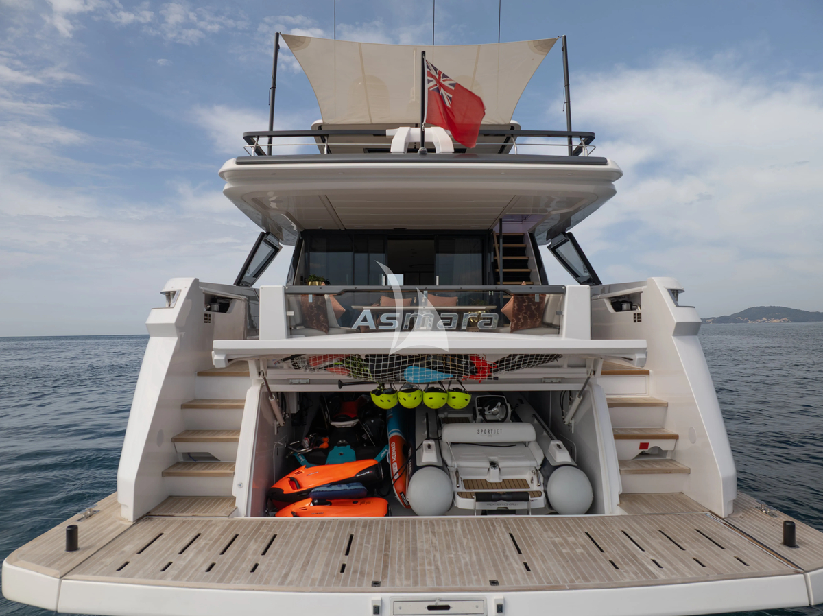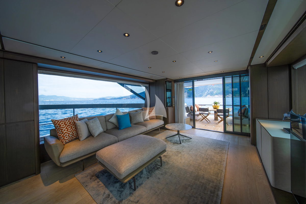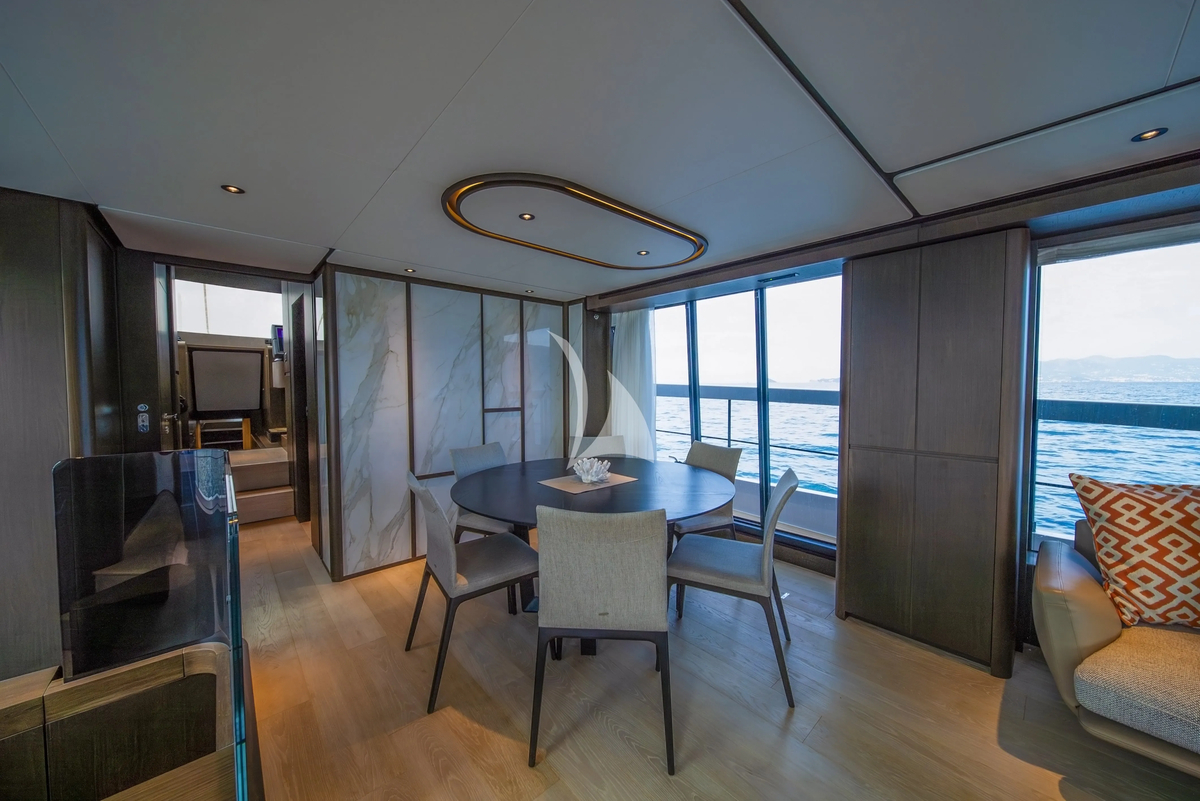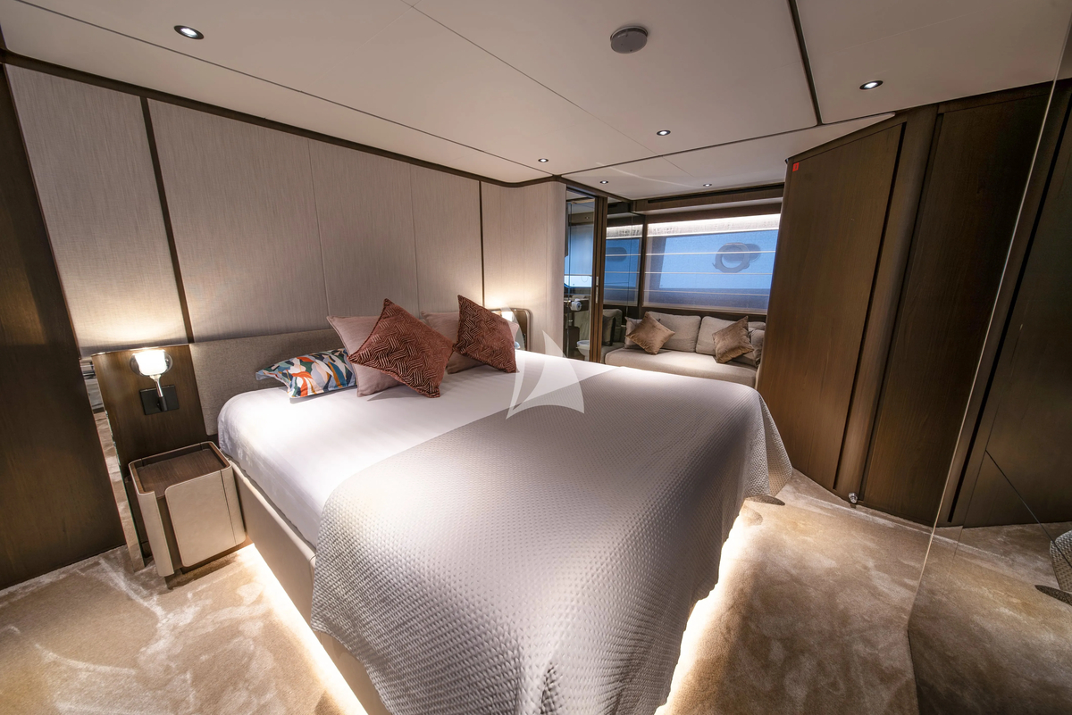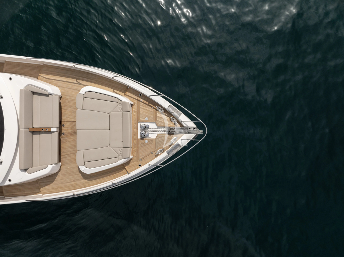 Generous exterior spaces, from the cockpit to the flybridge and foredeck, provide multiple settings for dining, sunbathing and entertaining, making the Ferretti 860 an ideal platform for a refined and effortless charter experience.
