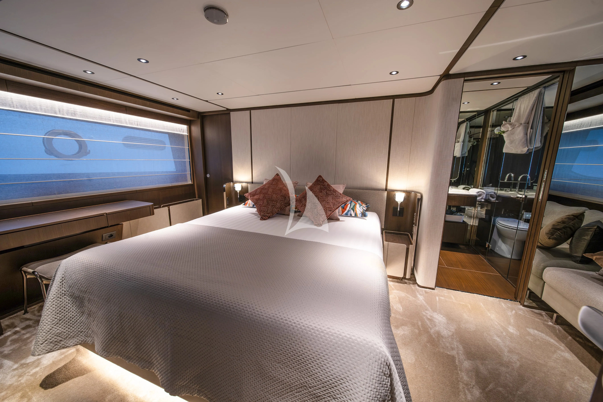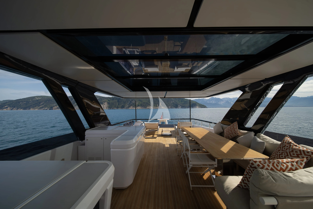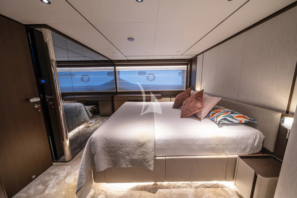 At 26,95 metres overall, she offers a beautifully balanced layout with four ensuite guest cabins, including a full beam master stateroom, and inviting social areas designed for relaxed cruising. The interiors are bright and contemporary, enhanced by panoramic windows that create a seamless connection with the sea.
