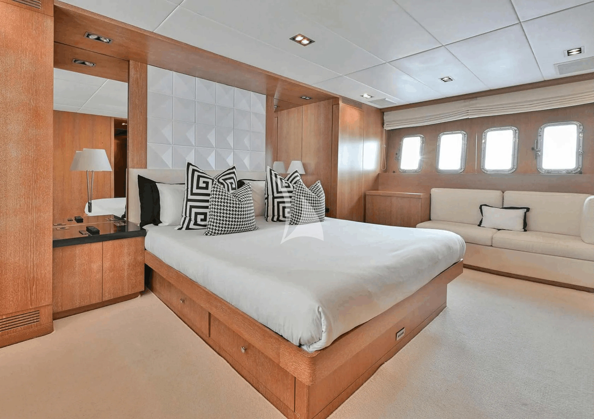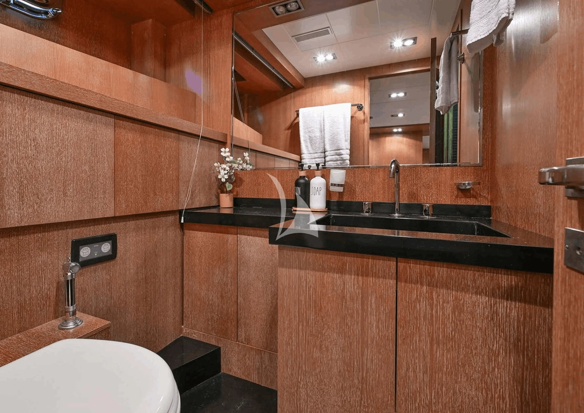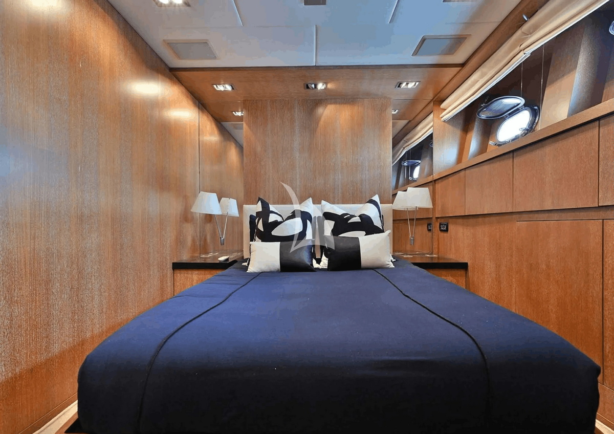 SMILE accommodates up to eight guests in four well-appointed cabins. The full-beam master suite, positioned amidships, benefits from excellent space and natural light, complete with sofa, vanity area, walk-in wardrobe and a spacious en-suite bathroom. Forward is a VIP double cabin with en-suite facilities, while a further double cabin and a twin cabin, both en-suite, complete the layout. All cabins are equipped with smart TVs and entertainment systems.