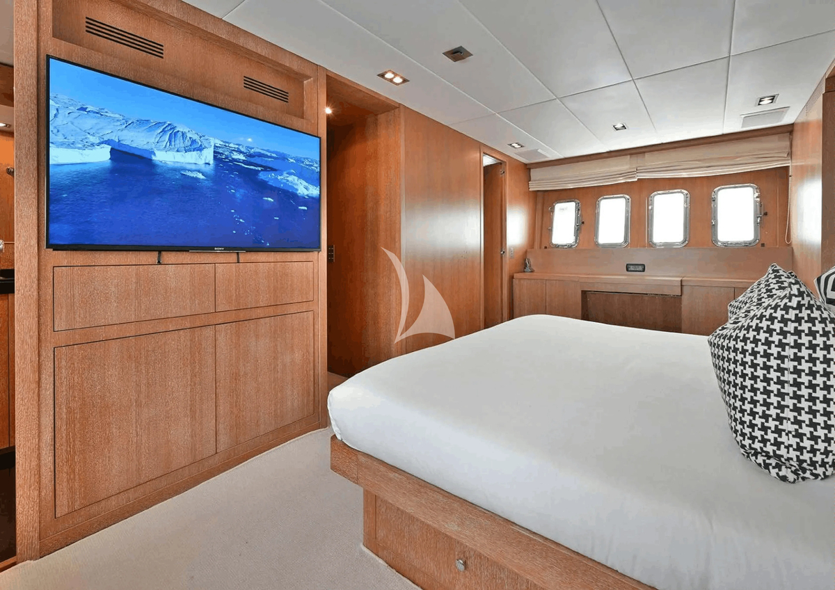 Her interior offers a contemporary yet welcoming ambience, where light oak finishes contrast beautifully with darker accents and soft neutral tones. The main saloon is bright and inviting, featuring generous sofas, a 50’’ smart TV, and a relaxed dining area. A discreet bar with refrigerators and an icemaker enhances onboard entertaining, while the wheelhouse forward integrates a comfortable leather seating area.